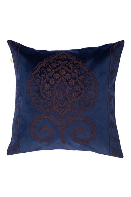 Navy velvet cushion covers with spade, floral and dori embroidery.