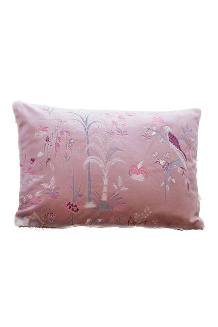 Lilac velvet cushion covers with floral, fauna, birds and tress embroidery.