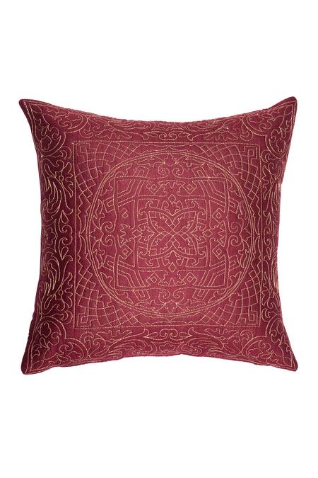 Wine chanderi silk cushion covers with geometric and zari embroidery.