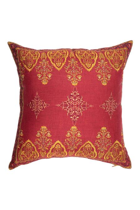 Maroon cotton linen cushion covers with floral, thread and resham embroidery.