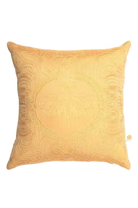 Gold chanderi silk cushion covers with dori embroidered butterfly.