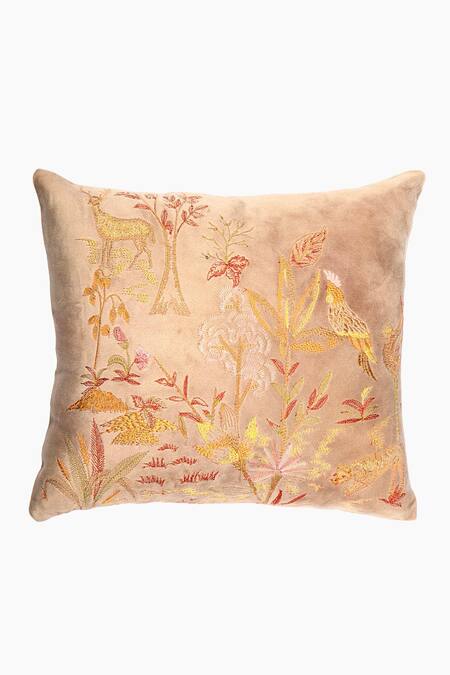 Coffee velvet cushion covers with floral, fauna, birds and tress embroidery.