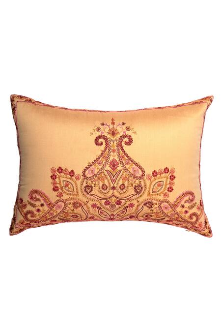 Beige chanderi silk cushion covers with multi-colored resham and paisley embroidery.