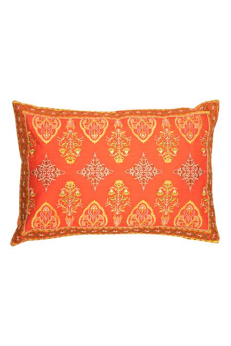Orange cotton linen cushion covers with thread and resham embroidery.