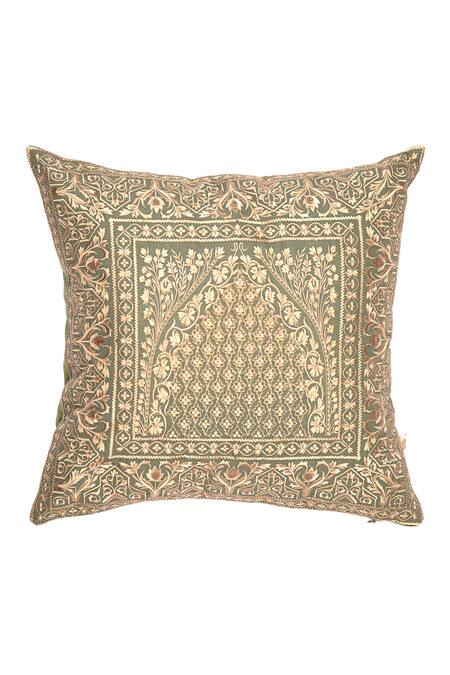 Green Cotton Linen Thread Shaakh Mehrab Embroidered Cushion Covers - 2 Pcs