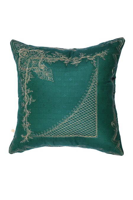 Deep bottle green chanderi silk cushion covers with thread embroidery.