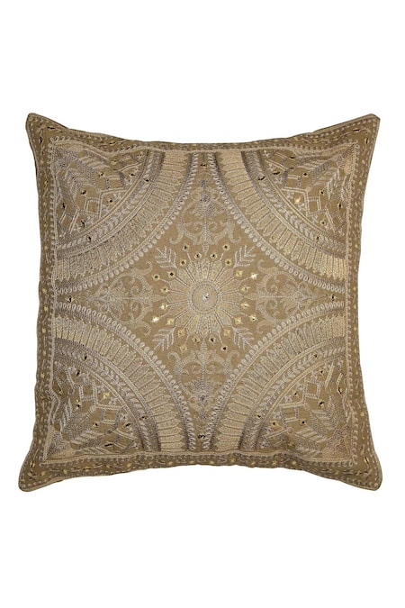 Coffee brown cushion cover embroidered with resham and mirror work.
