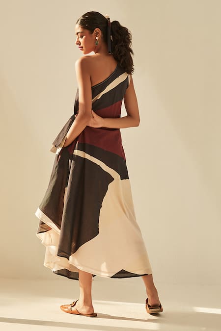 Black Cotton Asymmetric Aba One Shoulder Printed Dress