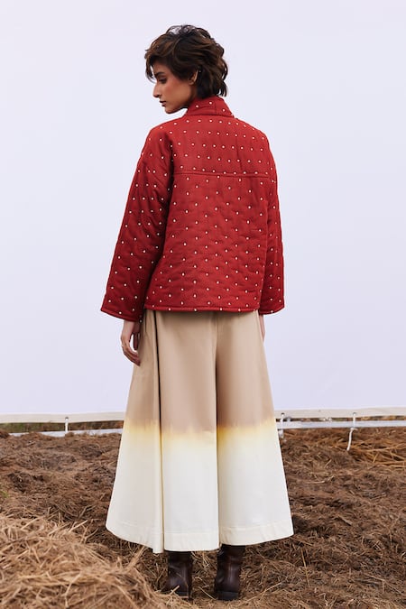 Buy_Kharakapas_Red Cotton Embroidery V-neck Amber Motif Pattern Quilted Jacket _at_Aza_Fashions