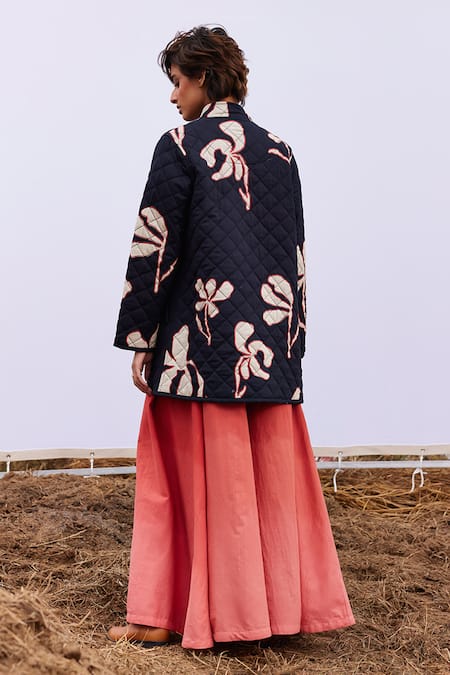 Black Cotton Mandarin Collar Ash Arum Lily Print Quilted Jacket