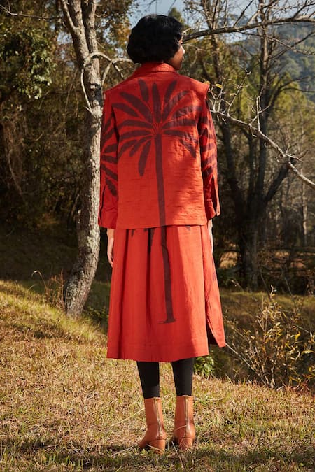 Red Cotton High , Shawl Autumn Blaze Print Reversible Jacket And Dress