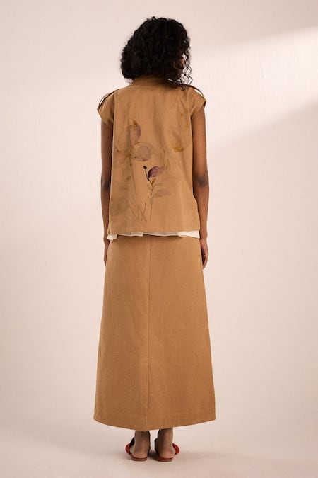 Beige twill cotton co-ord set featuring a subtle watercolor floral print. Includes a tunic with a notch lapel collar and a straight skirt with side seam pockets.