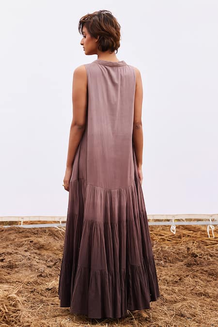 Plum purple sleeveless ombre tiered maxi dress crafted in cotton mul