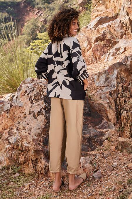 Black, off-white reversible jacket with abstract print on outer side & stripe pattern on inner side.