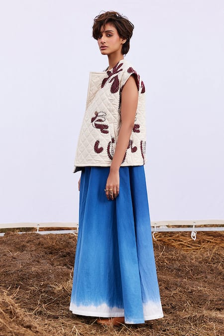 Buy_Kharakapas_Off White Denim Asymmetric Hazel Print Quilted Jacket _Online_at_Aza_Fashions