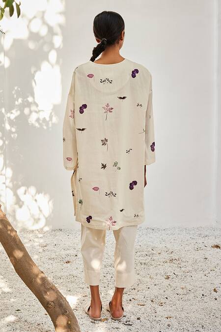 Off-white floral printed tunic featuring a notched neckline and full sleeves. Paired with matching trousers that have a front zipper and elasticated back.