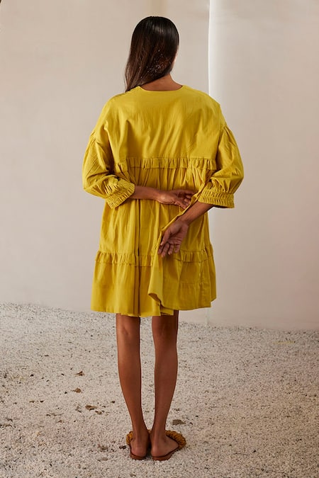Yellow Cotton V-neck Marigold Tiered Mul Dress