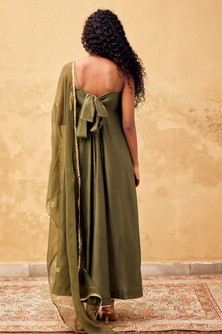 Sap green kurta featuring a sweetheart neckline, back tie-up, and gota lace embroidered hem. Paired with an embroidered kota doriya dupatta.