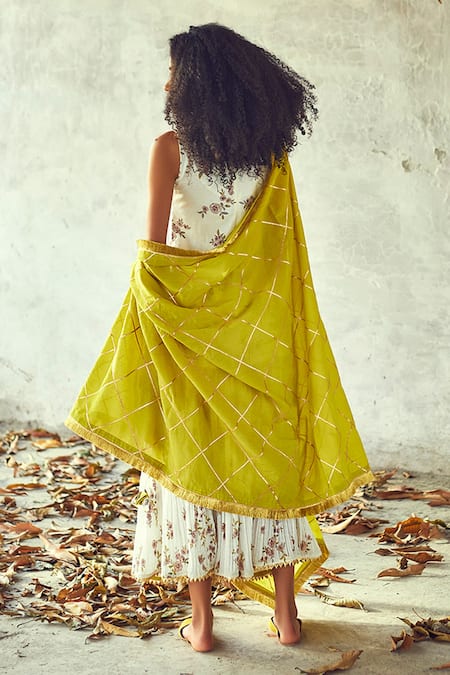 White kurta with floral print & cutwork hem. Paired with skirt & dupatta.