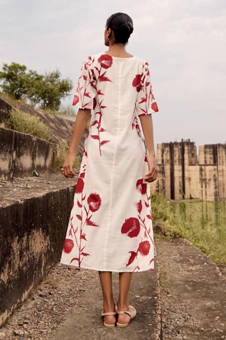Buy_Kharakapas_Off White Cotton V-neck Pomarine Lino Print Dress _Online_at_Aza_Fashions