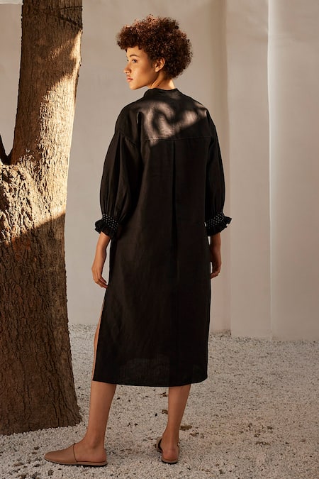 Black linen dress featuring a mandarin collar and smocked puff sleeves