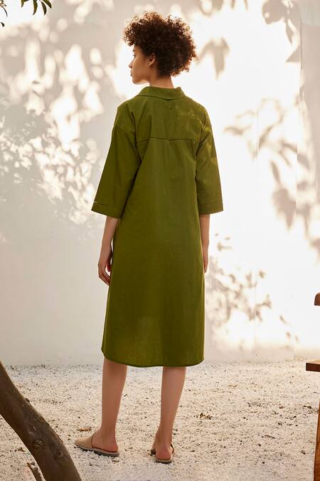 Green Cotton Embroidery Collared Spring Solid Poplin Shirt Dress
