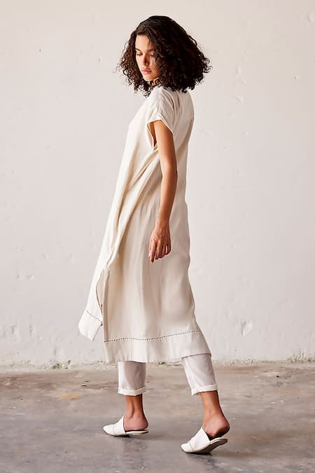 Off white gauge cotton kurta featuring a lapel collar, front button opening, and side slit. Paired with regular off-white mul trousers with an elasticated waistline.