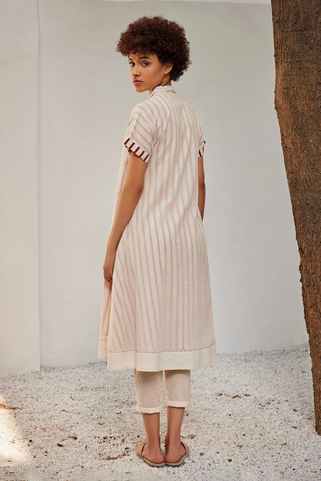 Off white mulmul cotton tunic featuring a lapel collar, striped print, and hand embroidered detailing at the hemline. Paired with elasticated trouser for comfort.