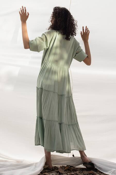 Sap green midi dress with tiered detail & half concealed placket.