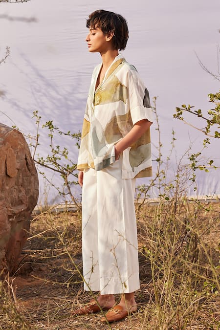 Off White Cotton Shawl Neck Verdure Floral Print Shirt And Pant Set
