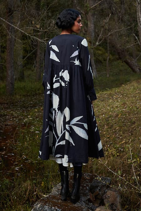Black Cotton Round , High And White Anar Print Midi Dress Set