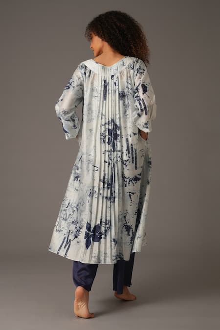 Blue and white kurta featuring a boat neck, three fourth sleeves, and side pockets. Paired with a matching pant, printed scarf, and inner.