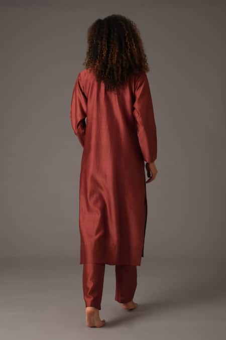 Maroon kurta featuring thread embroidery in floral pattern on the yoke. Paired with a slip and pant.