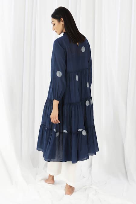 Navy blue tiered kurta featuring puff sleeves, high neckline, and polka patterns. Paired with an inner slip dress and pant.