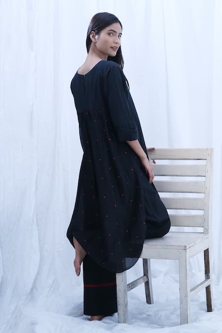 Black kurta featuring red polka dot print and roll-up sleeves. Paired with matching pants, a slip, and a scarf.