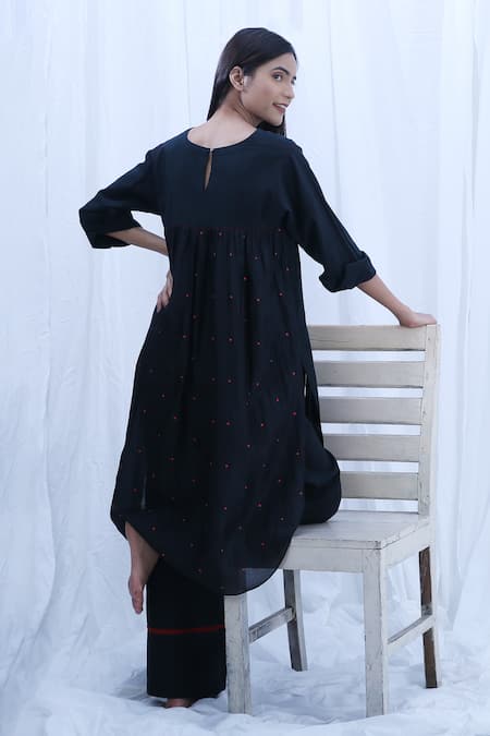 Black kurta featuring red polka dots print and roll-up sleeves. Paired with matching pant and slip.