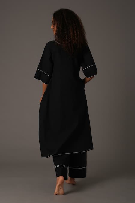 Black Handloom Cotton Round Stitchline Embroidered Front Slit Kurta With Pant