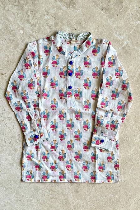 All-over floral handblock print design, Contrasting buttons on kurta, Kota fabric used for dhoti