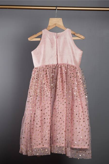 Peach dress featuring a round neckline, sleeveless design, and a back zip closure