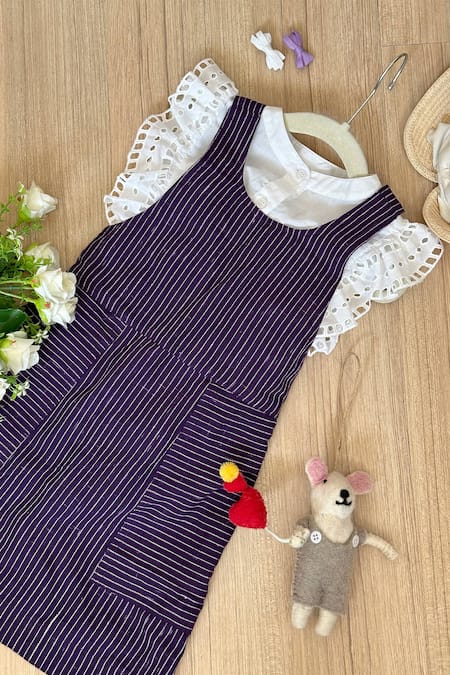 Purple striped pinafore dress crafted in cotton with woven detailing. Paired with a white flutter sleeve schiffli embroidered Hakoba top.