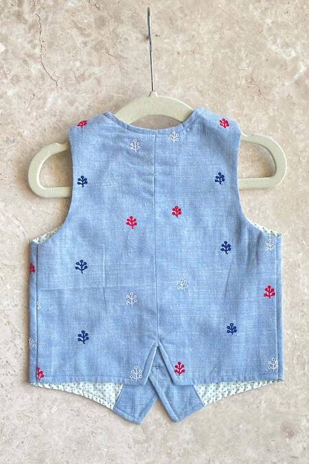 Blue Cotton Embroidered Thread Waistcoat Pant Set