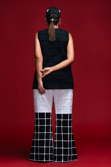 Black top featuring leaf motifs and a grid pattern with a relaxed fit. Paired with matching black and white grid patterned flared pants.