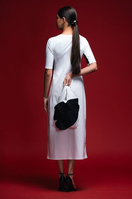 White column dress featuring oversized black petal embellishments