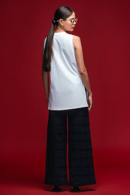 White top featuring floral applique designs and side slits. Paired with black wide-leg pants with a textured finish.