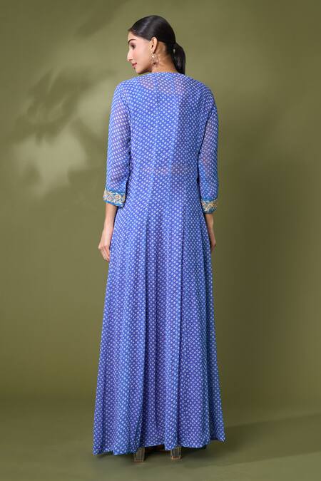 Blue longline multi-panelled jacket featuring bandhej print and gota embroidery. Paired with a solid inner top and flared pant.