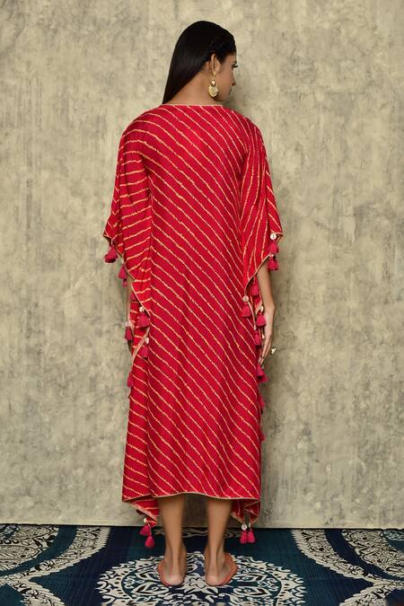 Buy_Samyukta Singhania_Red Bamboo Tassels V-neck Bandhej Print V Kaftan_Online_at_Aza_Fashions