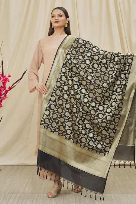 Black dupatta crafted from Banarasi art silk featuring a blossom woven pattern and fringe hem details