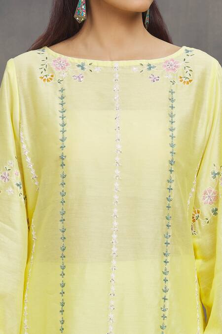 Yellow chanderi kurta featuring aari, thread, and sequin embroidery in floral pattern. Paired with matching pant that has embroidery on the hem.