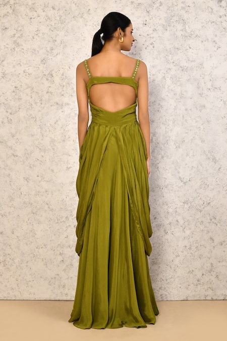 Olive green flared lehenga paired with a cutdana, sequin and bead embroidered blouse featuring a sweetheart neckline. The blouse includes drape details for added elegance.