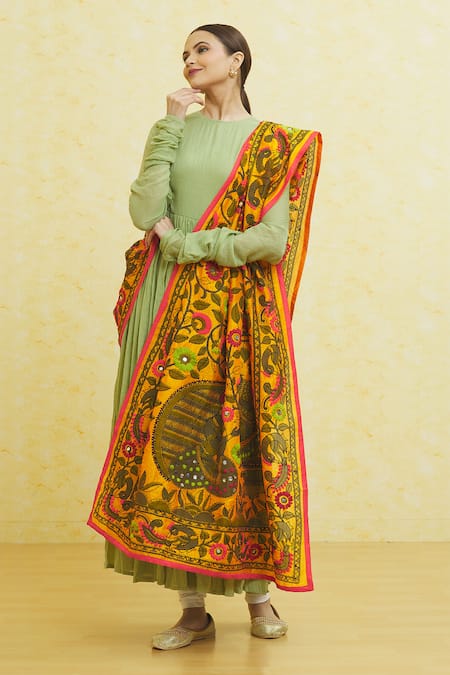 Orange Chanderi Mirrors Figurine And Botanical Pattern Phulkari Dupatta